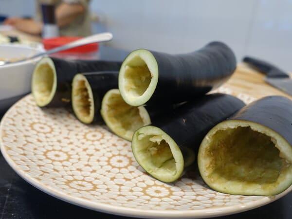 가지 속 파기: 가지의 양 끝을 잘라내고, 속이 물컹해질 정도로 양손으로 비빕니다. 이후 조리도구를 이용해 가지 속을 파내 줍니다.