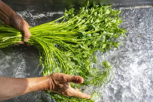 - 시든 잎을 제거하고 미나리를 흐르는 물에 흔들어가며 깨끗이 씻습니다.