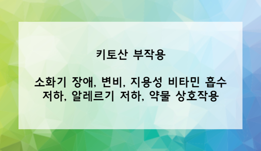 - 지용성 비타민 흡수 저하: 키토산은 지방을 흡착하는 능력 때문에, 지용성 비타민 (A, D, E, K)의 흡수를 저해할 수 있습니다.