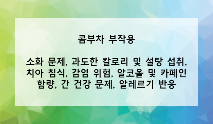 - 알레르기 반응 : 콤부차에 포함된 성분에 대한 알레르기 반응을 보이는 사람도 있습니다.