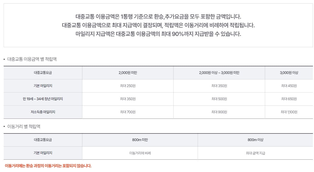 이동거리 기반 적립: 대중교통 이용 시, 출발지에서 승차점까지의 이동거리와 하차점에서 도착지까지의 이동거리 합산을 통해 마일리지를 적립합니다. 대중교통 1회 이용 시 이동거리는 최대 800m까지 인정됩니다.