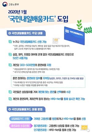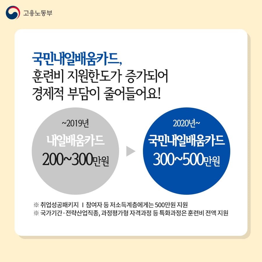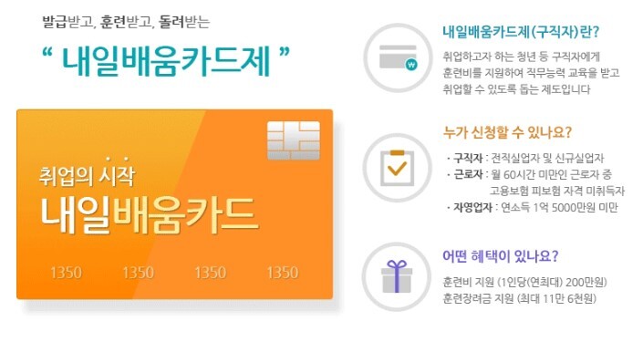 국민내일배움카드는 취업준비생,이직 희망자, 회사원, 중장년, 대학교 3학년 등 누구나 취업, 이직, 자기개발을 위해 훈련비를 45~85% 지원, 5년 동안 300만 원 ~ 500만 원까지 지원 받을 수 있는 정부지원 제도입니다.