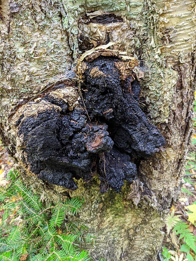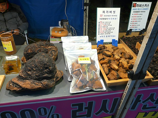 차가버섯(시베리아 언어: чага, 학명: Inonotus obliquus)은 특별한 종류의 버섯으로, 주로 자작나무 등의 나무에 기생하는 균류입니다. 그 특징적인 외관 때문에 차가버섯은 "타버섯" 또는 "나무의 탄"처럼 보일 수 있는데, 이것은 버섯의 검은색의 불규칙한 코(수목을 썩게 하는 부분) 때문입니다.