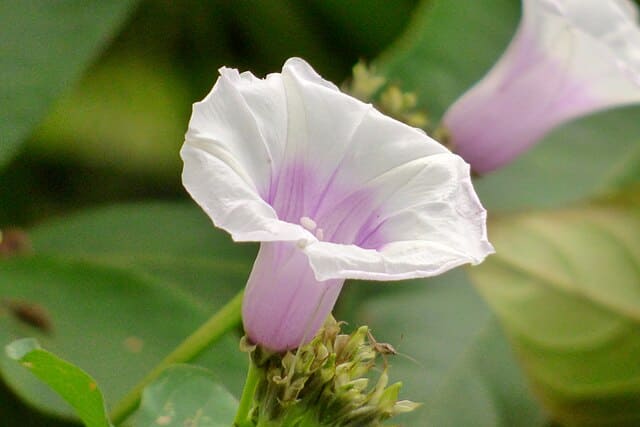 모양과 색상: 고구마 꽃은 보통 연한 라벤더색이나 연한 핑크색을 띄며, 나비 모양과 같은 모습의 꽃잎을 가지고 있습니다.