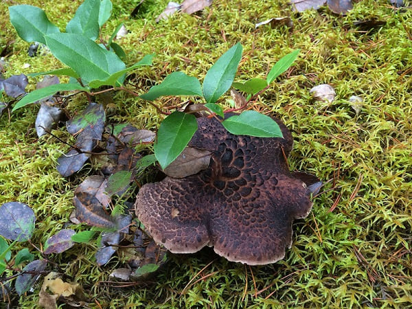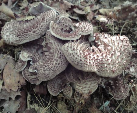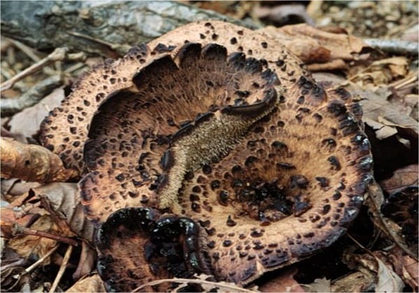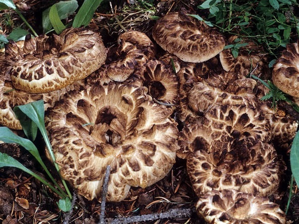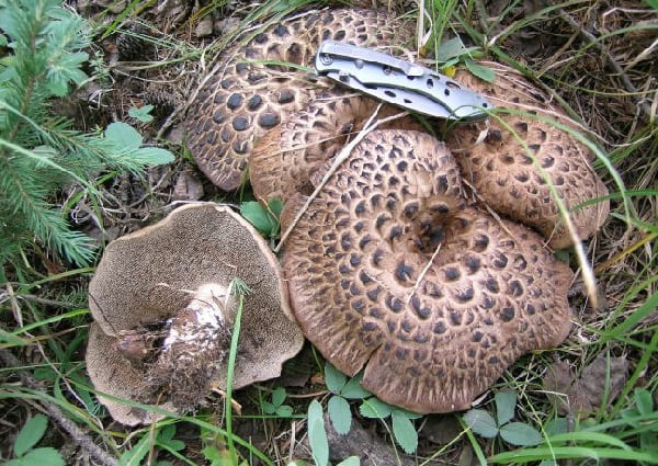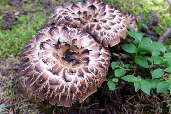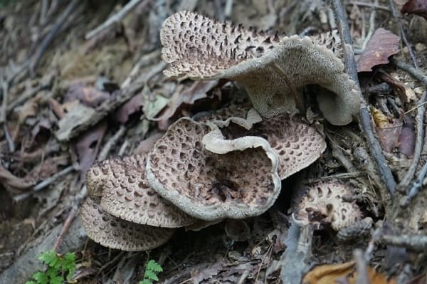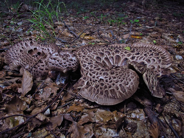 갓: 능이버섯은 중간 크기에서 매우 큰 크기까지 자랄 수 있으며, 흰색에서 어두운 갈색까지 다양한 색을 띱니다. 그리고 그 표면에는 눈에 띄는 비늘 같은 검은 색 점들이 있습니다.