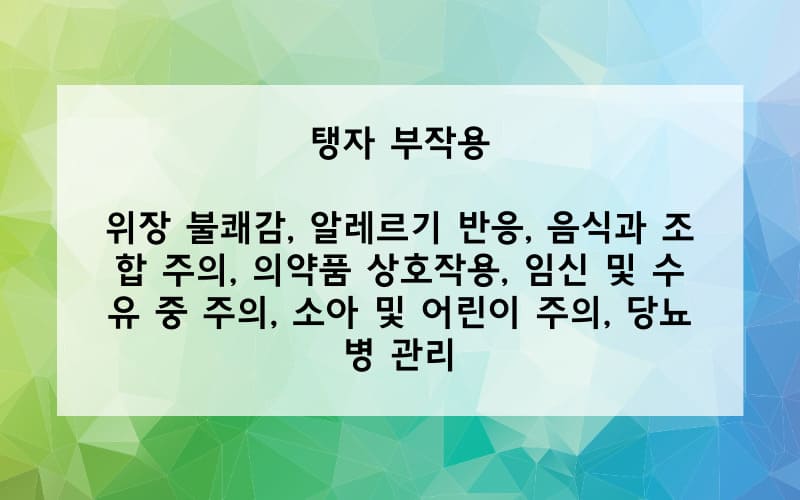 당뇨병 관리: 탱자에는 혈당 수준에 영향을 줄 수 있는 성분이 있으므로, 당뇨병을 관리하는 사람들은 과다한 섭취를 피해야 합니다. 혈당 수준을 주의 깊게 모니터링하고 의료 전문가와 상의해야 합니다.